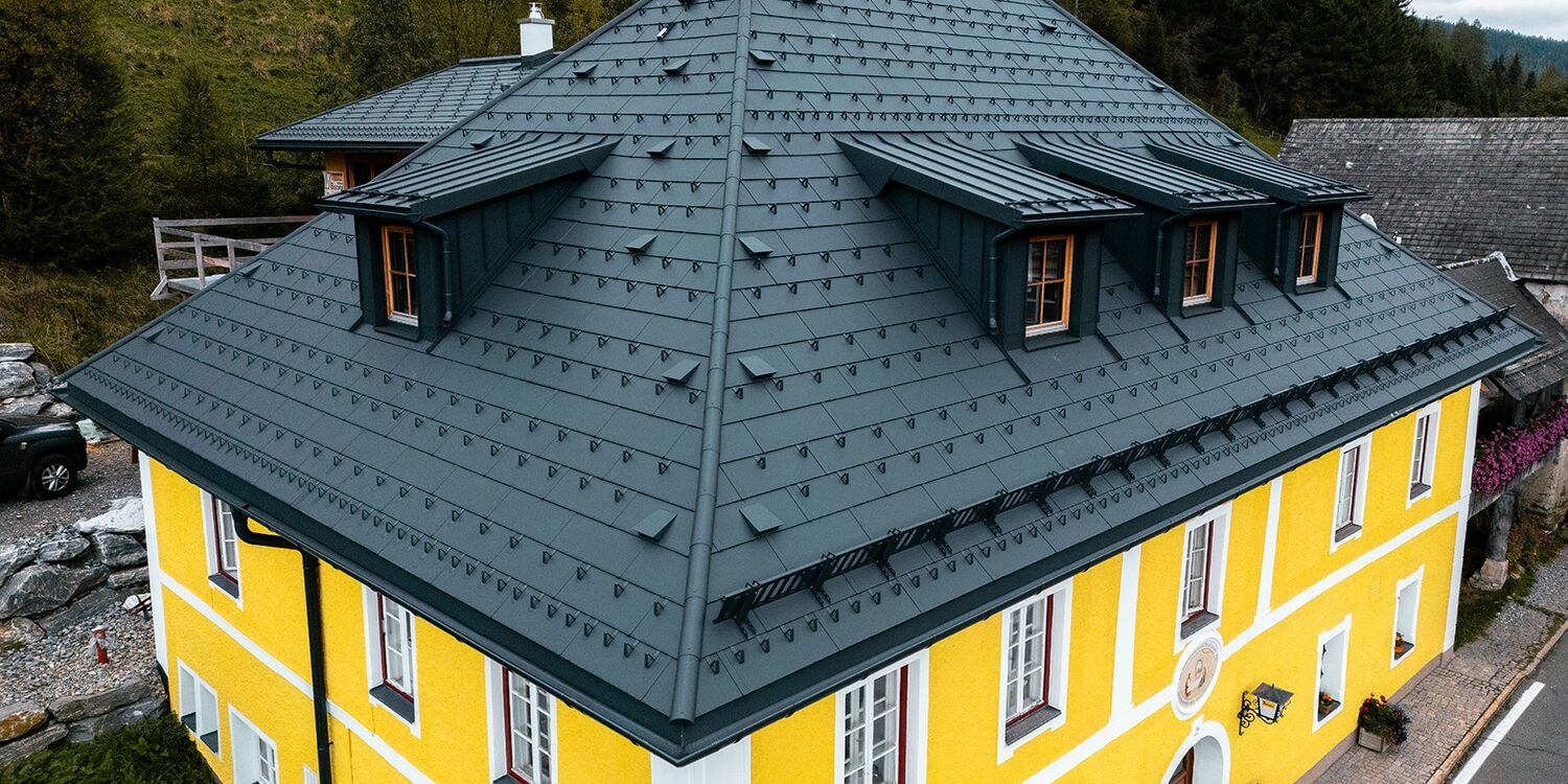 Um das ursprüngliche Erscheinungsbild des Hauses zu bewahren und gleichzeitig heutigen technischen Anforderungen gerecht zu werden, wurde das Dach mit FIGO Amade Dachplatten in Anthrazit neu eingedeckt. Die Arbeiten erfolgten durch die regionale Spenglerei und Dachdeckerei Bischof und wurden in enger Abstimmung mit dem Denkmalschutz umgesetzt. So konnten sowohl die historische Dachform als auch moderne bauphysikalische Standards berücksichtigt werden.