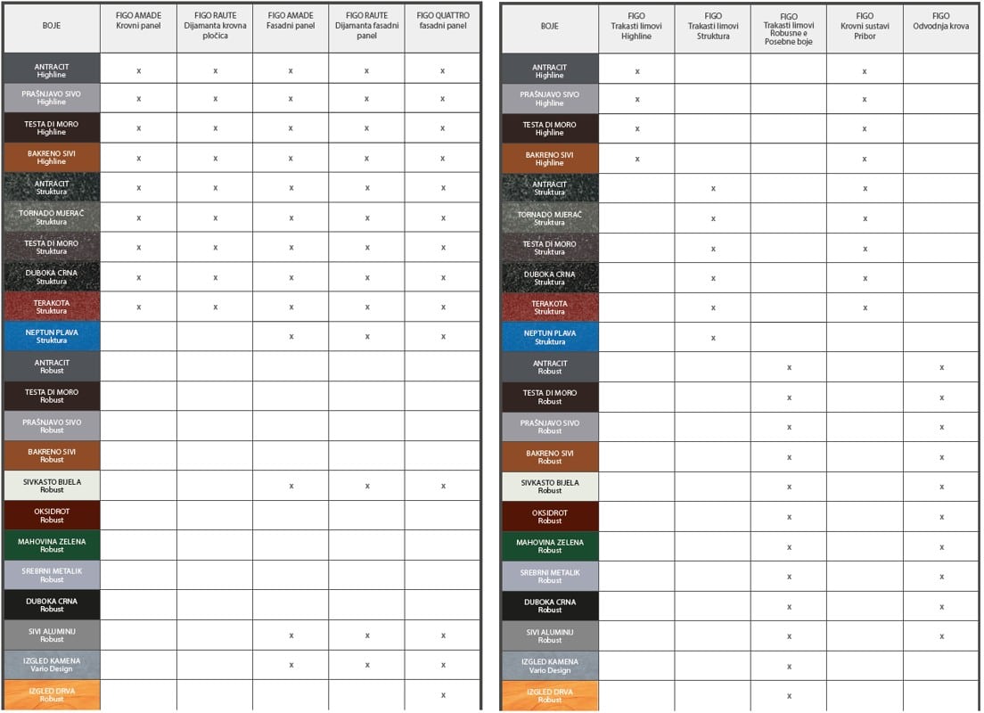Paleta boja FIGO kreće se od klasičnih tonova do živih, modernih kombinacija boja koje savršeno nadopunjuju svaki arhitektonski stil. Proizvodi su izrađeni od visokokvalitetnih materijala i rigorozno testirani na izdržljivost i otpornost kako bi se osiguralo da zadovoljavaju zahtjeve vašeg doma ili poslovnog prostora.
